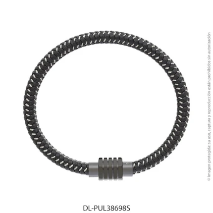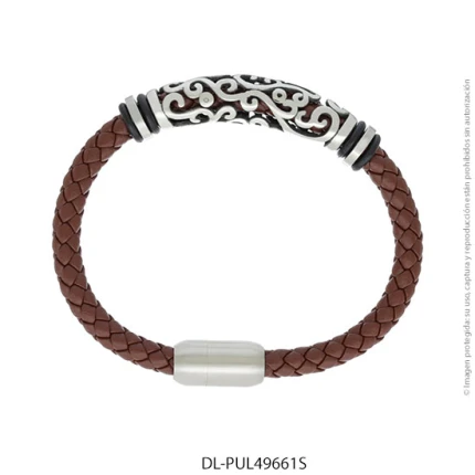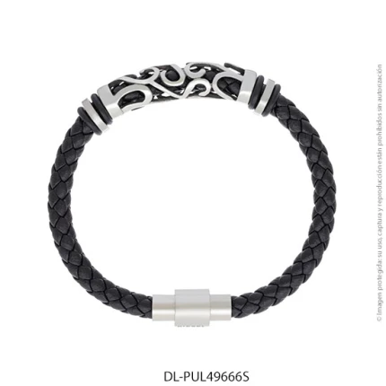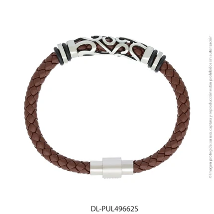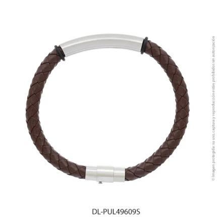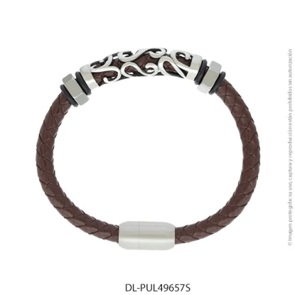 - Característica específica de la joya: pulsera de cuero trenzado con dije de acero