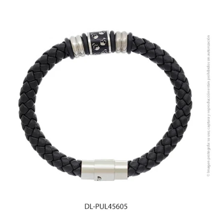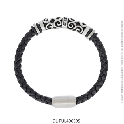 - Característica específica de la joya: pulsera de cuero trenzado con dije de acero y piedras