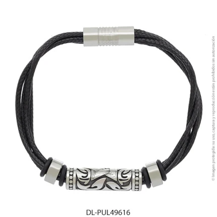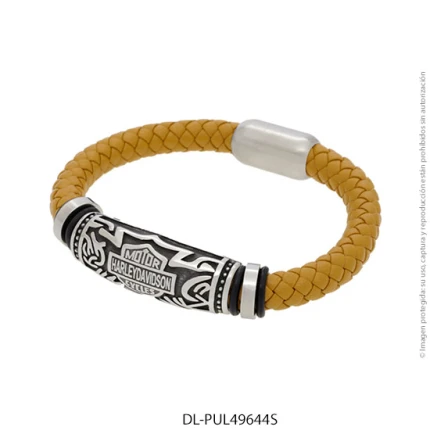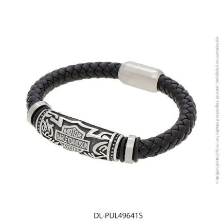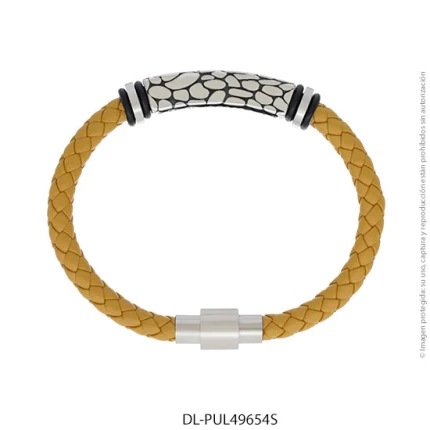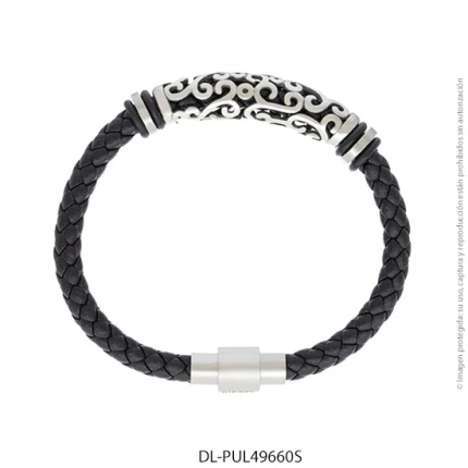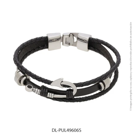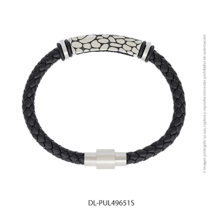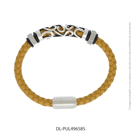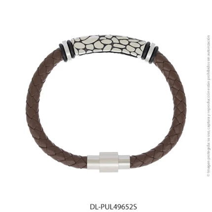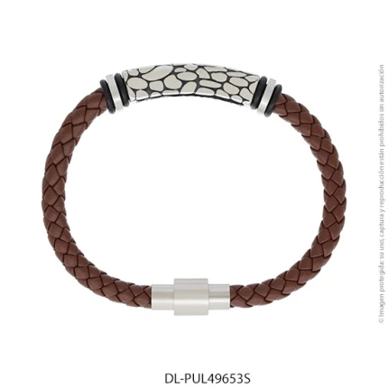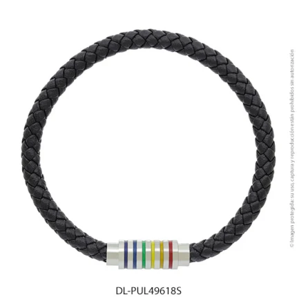 - Característica específica de la joya: pulsera de cuero trenzado con dije de acero esmaltado